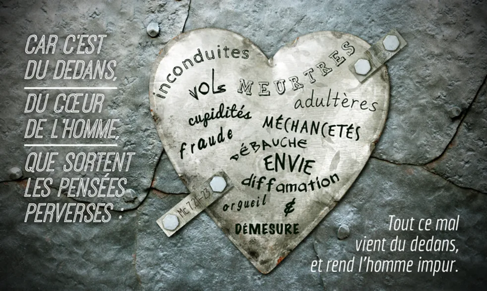 Khi ấy, Đức Giê-su lại gọi đám đông tới mà bảo: “Xin mọi người nghe tôi nói đây, và hiểu cho rõ: Không có cái gì từ bên ngoài vào trong con người lại có thể làm cho con người ra ô uế được; nhưng chính cái từ con người xuất ra, là cái làm cho con người ra ô uế. Ai có tai nghe thì nghe!” Khi Đức Giê-su đã rời đám đông mà vào nhà, các môn đệ hỏi Người về dụ ngôn ấy. Người nói với các ông: “Cả anh em nữa, anh em cũng ngu tối như thế sao? Anh em không hiểu sao? Bất cứ cái gì từ bên ngoài vào trong con người, thì không thể làm cho con người ra ô uế, bởi vì nó không đi vào lòng, nhưng vào bụng người ta, rồi bị thải ra ngoài?” Như vậy là Người tuyên bố mọi thức ăn đều thanh sạch. Người nói: “Cái gì từ trong con người xuất ra, cái đó mới làm cho con người ra ô uế. Vì từ bên trong, từ lòng người, phát xuất những ý định xấu: tà dâm, trộm cắp, giết người, ngoại tình, tham lam, độc ác, xảo trá, trác táng, ganh tị, phỉ báng, kiêu ngạo, ngông cuồng. Tất cả những điều xấu xa đó, đều từ bên trong xuất ra, và làm cho con người ra ô uế.”