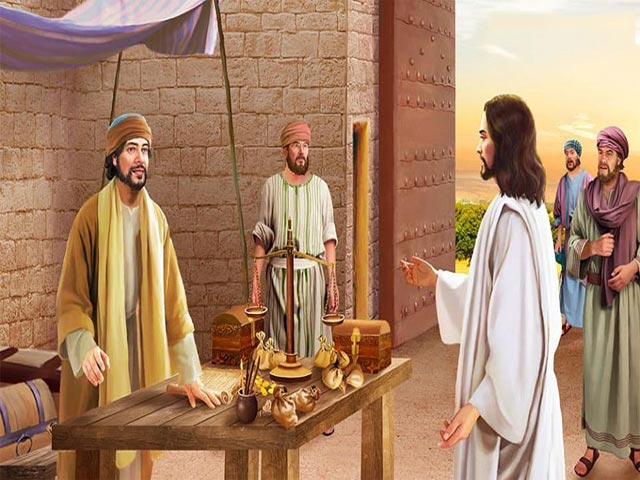 Bỏ nơi ấy, Đức Giêsu đi qua trạm thu thuế, thì thấy một người tên là Mát thêu đang ngồi tại trạm. Người bảo ông: “ Anh hãy theo tôi!”. Ông đứng dậy đi theo Người. Khi Đức Giêsu đang ngồi dùng bữa tại nhà ông ấy, có nhiều người thu thuế và tội lỗi kéo đến, cùng ăn với Người và các môn đệ. Thấy vậy, những người Pha ri sêu nói với các môn đệ Người rằng: “ Sao Thầy các anh lại ăn uống với bọn thu thuế và quân tội lỗi như vậy ?”. Nghe thấy thế, Đức Giêsu nói : “ Người khỏe mạnh không cần thầy thuốc, người đau ốm mới cần. Hãy về học cho biết ý nghĩa của câu này: Ta muốn lòng nhân chứ đâu cần lễ tế. Vì tôi đến để kêu gọi người công chính, mà để kêu gọi người tội lỗi”.